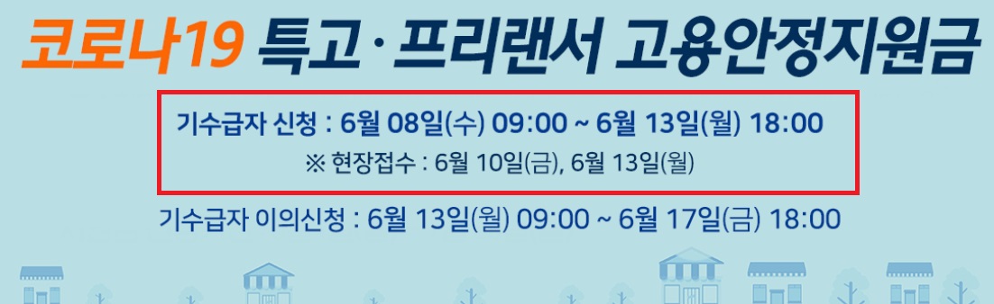 - 방문 신청 : 6월10일(금), 6월13일(월) 이틀 동안 인근 고용센터에서 신청(신분증, 통장사본 지참)